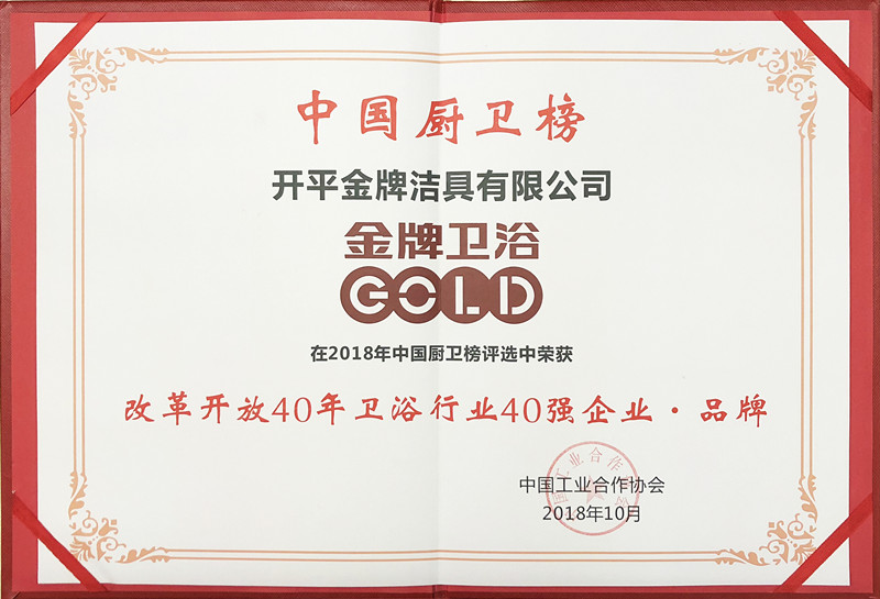 中国厨卫榜改革开放40年卫浴行业40强企业·品牌证书